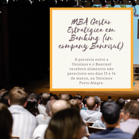 Nos dias 13 e 14 de março, o MBA In Company Gestão Estratégica em Banking - uma parceria entre a Unisinos e o Banrisul - realiza mais uma atividade integradora com cerca de 300 alunos. O evento contará com doações de alimentos em prol do Banco de Alimentos de Porto Alegre.
